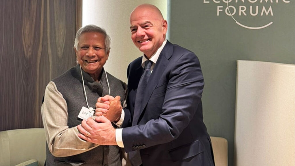 বুধবার (২২ জানুয়ারি) সুইজারল্যান্ডের দাভোসে বিশ্ব অর্থনৈতিক ফোরামের বাৎসরিক সভার ফাঁকে প্রধান উপদেষ্টা অধ্যাপক মুহাম্মদ ইউনূসের সঙ্গে সাক্ষাৎকালে ফিফা প্রধান এ প্রতিশ্রুতি দেন। বিষয়টি সামাজিক মাধ্যমে প্রধান উপদেষ্টার প্রেস উইং নিশ্চিত করেছেন।