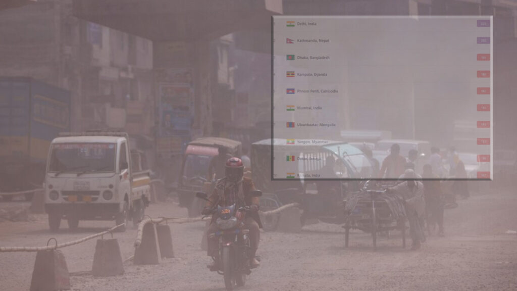 সংস্থাটি জানায়, ২২২ স্কোর নিয়ে বায়ু দূষণের তালিকার শীর্ষে অবস্থান করছে ভারতের দিল্লি, সেখানকার বাতাসের মান খুব অস্বাস্থ্যকর। দ্বিতীয় স্থানে রয়েছে নেপালের কাঠমান্ডু। তাদের স্কোর ২০২, অর্থাৎ সেখানকার বাতাসও বসবাসকারীদের জন্য খুব অস্বাস্থ্যকর।