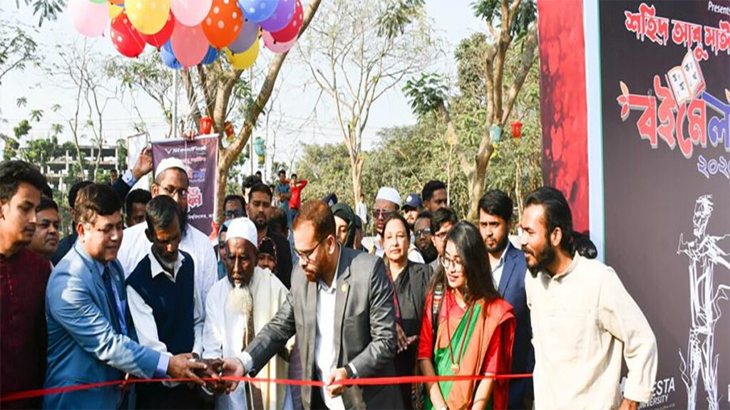 মঙ্গলবার (১৮ ফেব্রুয়ারি) বিকেলে বিশ্ববিদ্যালয়ের স্বাধীনতা স্মারক মাঠে বইমেলার উদ্বোধন করেন শহীদ আবু সাঈদের বাবা মকবুল হোসেন এবং সীমান্তে বিএসএফের গুলিতে নিহত কিশোরী ফেলানী খাতুনের বাবা নূর ইসলাম।