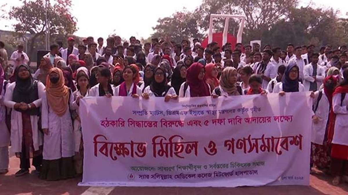 ডিপ্লোমা অব মেডিকেল ফ্যাকাল্টি (ডিএমএফ) ও মেডিকেল অ্যাসিস্ট্যান্ট ট্রেনিং স্কুল (ম্যাটস) ডিগ্রিধারীদের বিষয়ে স্বাস্থ্য মন্ত্রণালয়ের সিদ্ধান্ত বাতিলের দাবিতে বিক্ষোভ করেছেন বিভিন্ন মেডিকেল কলেজের শিক্ষার্থীরা। এ সময় ডিএমএফ ডিগ্রিধারীদের চিকিৎসক পদবি সংক্রান্ত রিট দ্রুত নিষ্পত্তির দাবিও জানানো হয়।