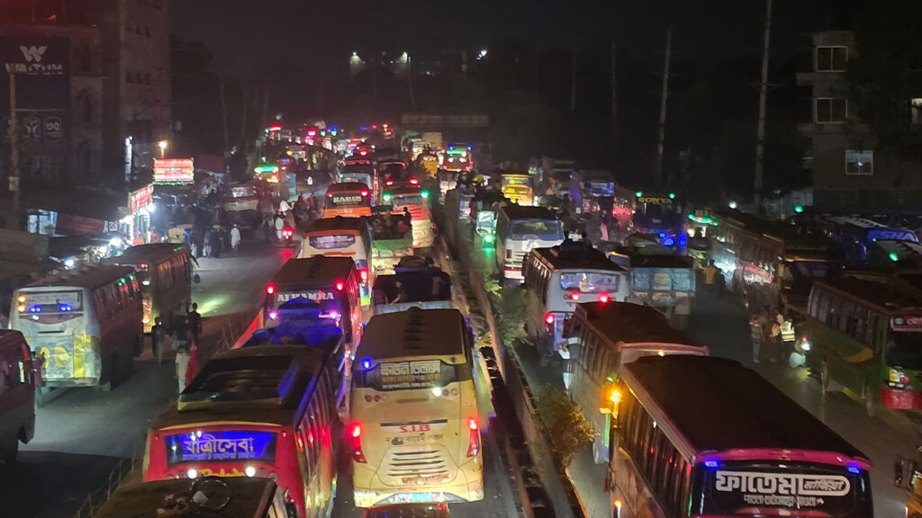 শুক্রবার (২৮ মার্চ) চন্দ্রার আশপাশে কয়েক কিলোমিটার এলাকার জুড়ে যানবাহনের দীর্ঘ সারি লক্ষ্য করা গেছে। এতে ধীরগতিতে থেমে থেমে যানবাহন গুলো চলাচল করছে।