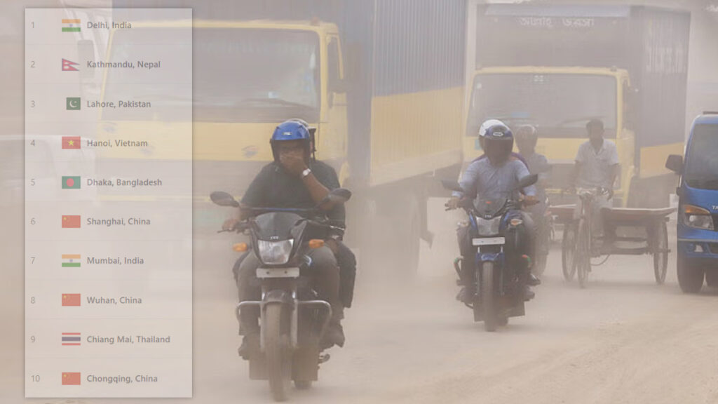 সংস্থাটি জানায়, ২৮৮ স্কোর নিয়ে বায়ু দূষণের তালিকার শীর্ষে অবস্থান করছে ভারতের দিল্লি। দ্বিতীয় স্থানে রয়েছে নেপালের কাঠমান্ডু, স্কোর ২২৯। তৃতীয় স্থানে থাকা পাকিস্তানের লাহোরের স্কোর ২০৪। এই তিন শহরের বাতাসের মান ‘খুব অস্বাস্থ্যকর’।