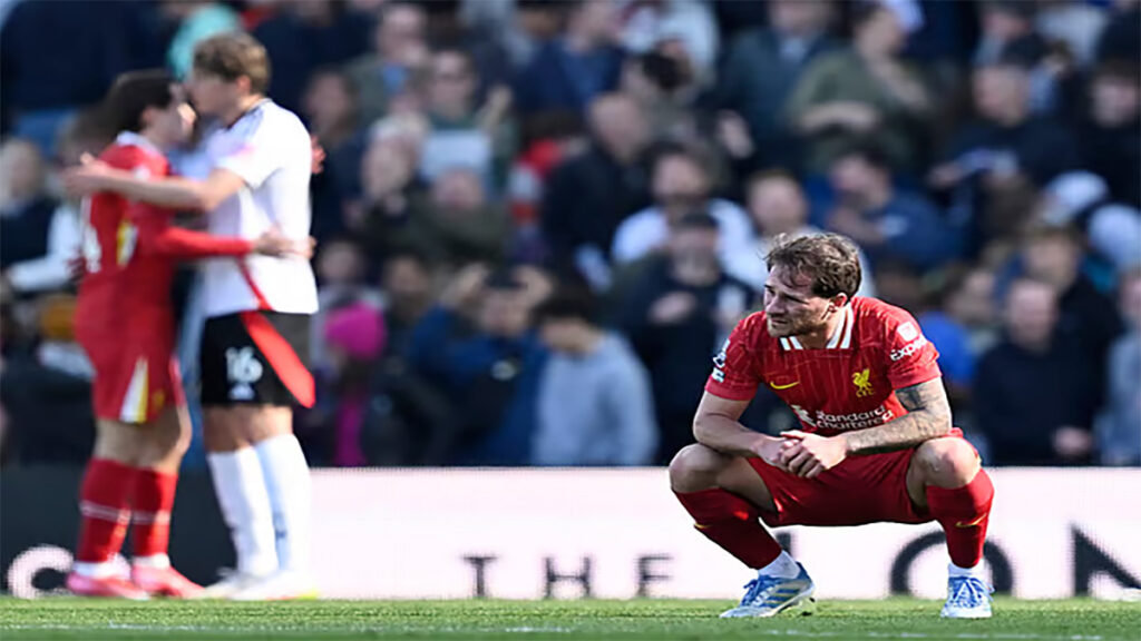 রোববার (৬ এপ্রিল) ক্রাভেন কটেজে ১৪ মিনিটের এক ঝড়ে লিভারপুলকে লন্ডভন্ড করে দিয়েছে ফুলহাম। আর্জেন্টাইন আলেক্সিস ম্যাক-অ্যালিস্টারের গোলে লিভারপুল শুরুতেই এগিয়ে গেলেও রায়ান সেসেগনন, আলেক্স আইয়োবি এবং রদ্রিগো মুনিজ গোল করে ফুলহ্যামকে এগিয়ে দেন। ২৩ থেকে ৩৭— এই ১৪ মিনিটেই গোল তিনটি হজম করে আর্নে স্লটের শিষ্যরা।