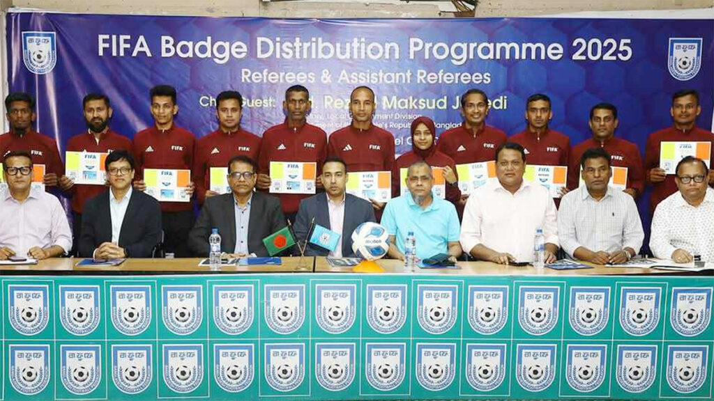 বাংলাদেশের রেফারিদের ২০২৫ ফিফা ব্যাজ দিয়েছে বাফুফে। বুধবার (৯ এপ্রিল) বিকেলে সভাপতি তাবিথ আউয়াল ও ক্রীড়া মন্ত্রণালয়ের সাবেক সচিব রেজাউল মাকছুদ জাহেদী ১১ জন রেফারির হাতে এই ব্যাজ তুলে দেন। ব্যাজ তুলে দেওয়ার পর ফিফার বর্তমান ও সাবেক রেফারিদের সঙ্গে বৈঠকে বসেছিলেন বাফুফে সভাপতি।