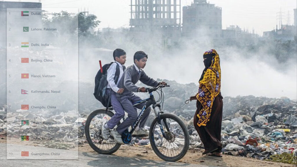 বিশ্বের দূষিত শহরের তালিকায় আজ ৬০৩ স্কোর নিয়ে শীর্ষে অবস্থান করছে দুবাই শহর। এ অঞ্চলের বাতাস ‘ঝুঁকিপূর্ণ’ অবস্থায় রয়েছে। পাকিস্তানের লাহোর ও ভারতের দিল্লি সমান ১৭০ স্কোর নিয়ে যথাক্রমে দ্বিতীয় ও তৃতীয় স্থানে রয়েছে। এই দুই শররের বাতাস অস্বাস্থ্যকর।