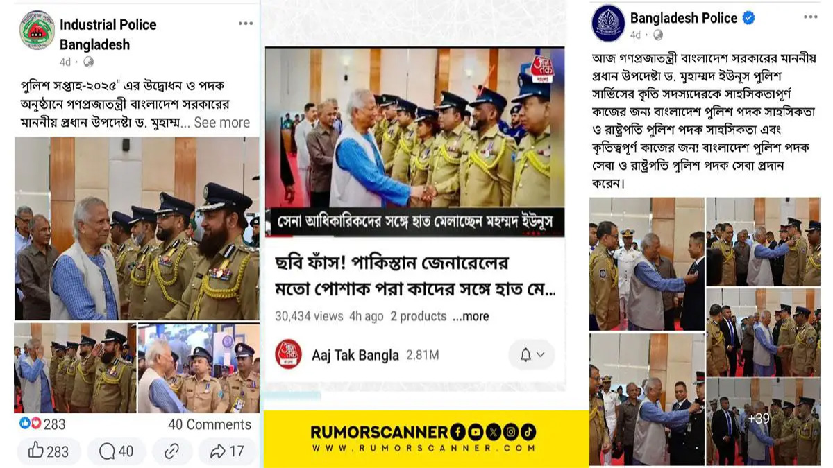 বাংলাদেশ পুলিশের কর্মকর্তাদের সঙ্গে অন্তর্বর্তী সরকারের প্রধান উপদেষ্টা ড. মুহাম্মদ ইউনূসের করমর্দনের ছবিকে পাকিস্তান সেনাবাহিনীর সঙ্গে ড. ইউনূসের করমর্দনের ছবি বলে বিভ্রান্তিকর তথ্য ছড়িয়েছে ভারতীয় সংবাদমাধ্যম ‘আজতক বাংলা’। তবে দাবিটি মিথ্যা বলে জানায় তথ্য যাচাইকারী (ফ্যাক্ট চেকার) সংস্থা রিউমার স্ক্যানার।