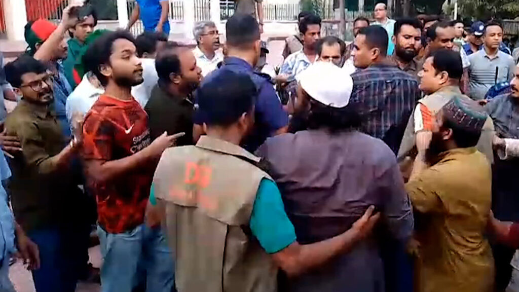 এমন সময়, একটি দল সেখানে আনুষ্ঠানিকতা বন্ধে উদীচির লোকদের চাপ দেয়। পরে, বাগবিতণ্ডা থেকে হাতাহাতির ঘটনাও ঘটে। একপর্যায়ে বন্ধ হয়ে যায় জাতীয় সংগীত পরিবেশন কর্মসূচি।
