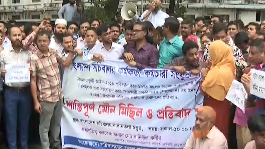 বিনা তদন্তে ৮ দিনের নোটিশে চাকরি থেকে অব্যাহতির বিধান রেখে সরকারি চাকরি আইন সংশোধনের উদ্যোগের প্রতিবাদে সচিবালয়ের কর্মকর্তা-কর্মচারীরা বিক্ষোভ করেছে।