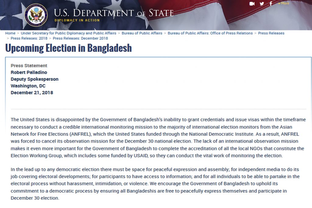 সব দলের জন্য প্রচারণার সমান সুযোগ এবং সংবাদ মাধ্যমের স্বাধীনতা নিশ্চিতের আহ্বানও জানানো হয়। মার্কিন পররাষ্ট্র দফতরের সহকারী মুখপাত্র রবার্ট পালাডিনো বিবৃতিতে বলেন, সকল নাগরিকের জন্য ৩০ ডিসেম্বর সুষ্ঠু গণতান্ত্রিক প্রক্রিয়া অনুসরণ করে একটি নিরপেক্ষ নির্বাচন আয়োজনের জন্য আমরা বাংলাদেশ সরকারকে উৎসাহিত করছি।’