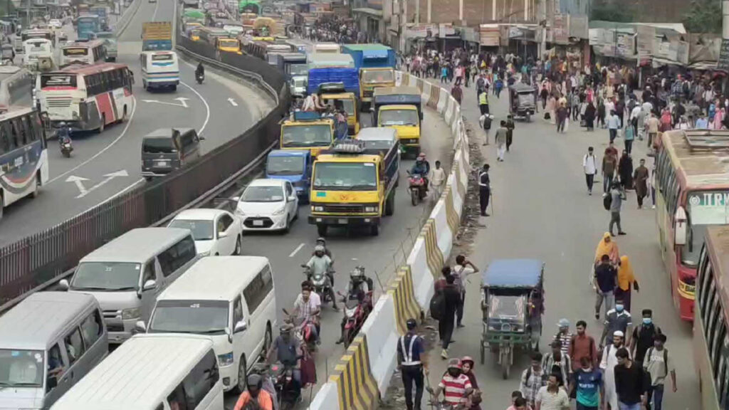 গতকাল বুধবার কয়েক ধাপে কারখানা ও বেসরকারি প্রতিষ্ঠানে ঈদের ছুটি ঘোষণা করেছে। ফলে আজ প্রতিষ্ঠানগুলোর কর্মকর্তা-কর্মচারীরা বাড়ির উদ্দেশ্যে গাজীপুর ছাড়ছেন। এতে মহাসড়কে যাত্রীদের চাপ কয়েকগুন বেড়েছে।