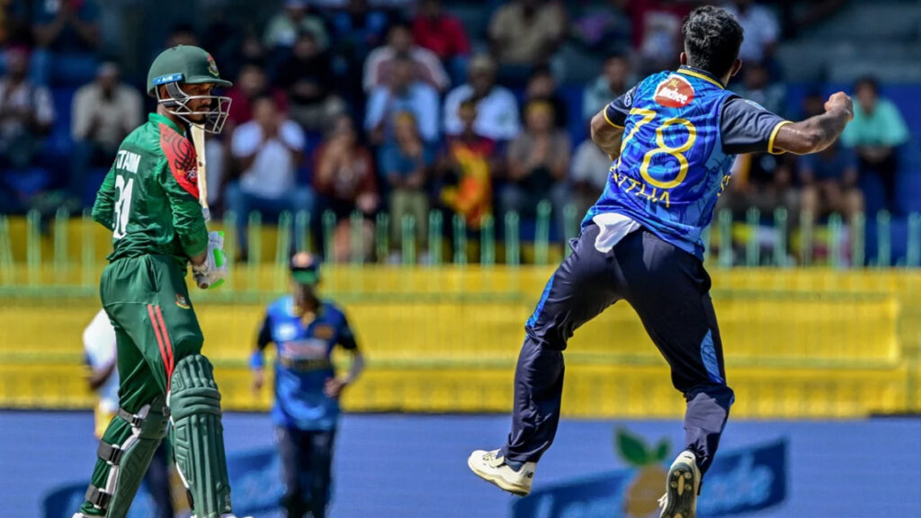 এরপর হাসান মাহমুদ ও তানভীর ইসলাম আউট হন দ্রুতই। শেষ দিকে মোস্তাফিজকে সঙ্গে নিয়ে একাই লড়াই করেন তানজিম হাসান সাকিব। সমান দুটি করে ছক্কা ও চারে ২১ বলে অপরাজিত ৩৩ রানের ক্যামিও ইনিংস খেলেন তানজিম। ৪.১ ওভার বাকি থাকতে ওয়ানিন্দু হাসারাঙ্গার বলে এলবিডব্লিউ-এর ফাঁদে পড়েন মোস্তাফিজ। আর তাতেই ২৪৮ রানে অলআউট হয় বাংলাদেশ।