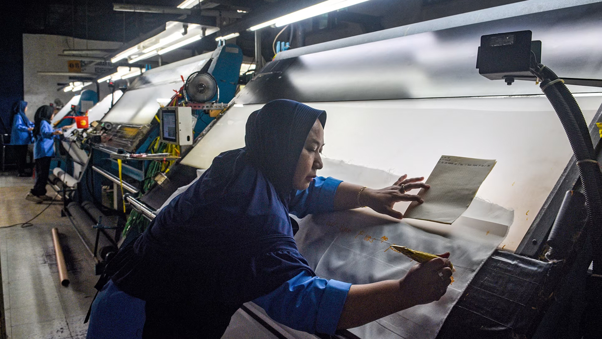 একজন শ্রমিক ইন্দোনেশিয়ার পশ্চিম জাভার সিমাহিতে ত্রিসুলা টেক্সটাইল ইন্ডাস্ট্রিজের কারখানায় রফতানির জন্য রং করার প্রক্রিয়ার আগে ফ্যাব্রিক চেক করছেন। ছবি: সিনএনএন নিউজ।