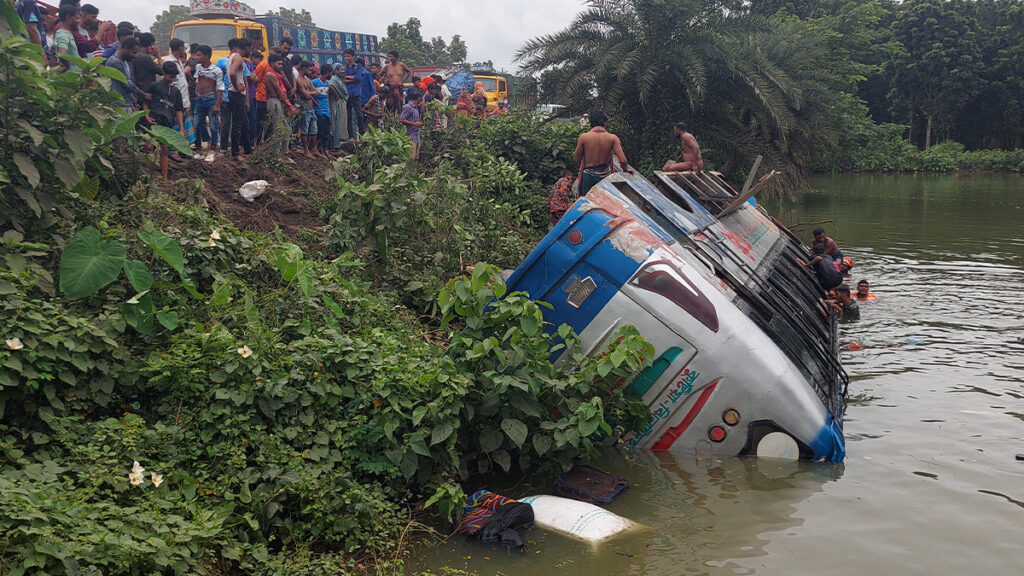 স্থানীয়রা জানায়, দুপুর ১টার দিকে কালীগঞ্জ থেকে ছেড়ে আসা যশোরগামী গড়াই পরিবহনের এক বাস অন্য আরেক বাসকে ওভারটেক করতে গিয়ে নিয়ন্ত্রণ হারিয়ে পুকুরে পড়ে যায়। এ সময় স্থানীয় ও ফায়ার সার্ভিসের কর্মীরা আহত ১০ জনকে উদ্ধার করে উপজেলা স্বাস্থ্য কমপ্লেক্সে নিয়ে যায়।
