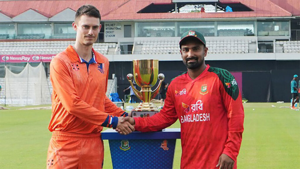 সিলেটে দলীয় ১৪ রানে ভাঙ্গে ডাচদের ওপেনিং জুটি। ৮ রান করে নাসুমের স্পিনে কাটা পড়েন ম্যাক্স ও’দাউদ। এরপর নিদামানুরুকেও খালি হাতে ফেরান এই বাঁহাতি স্পিনার। ডাচদের রান যখন ৩৭, তখন বিক্রমজিত সিংকে সাজঘরের পথ দেখান পেসার তাসকিন আহমেদ।