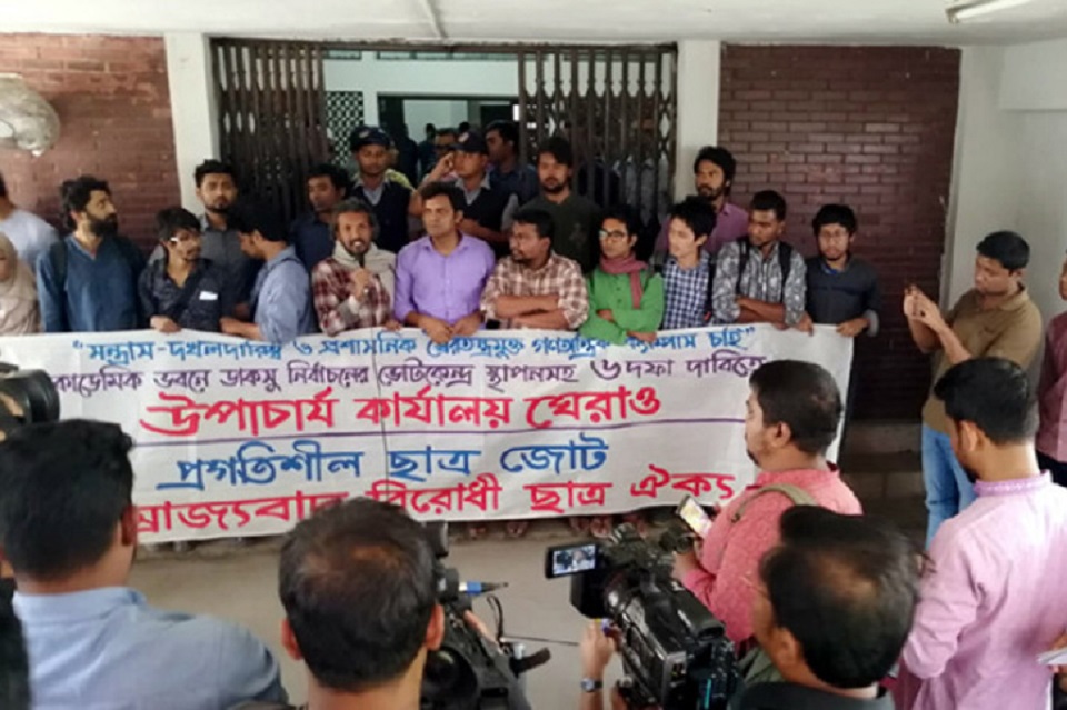 ডাকসু নির্বাচনে হলের বাইরে কেন্দ্রসহ নানা দাবিতে উপাচার্যের কার্যালয় ঘেরাও কর্মসূচি পালন করেছে প্রগতিশীল ছাত্রজোট।
