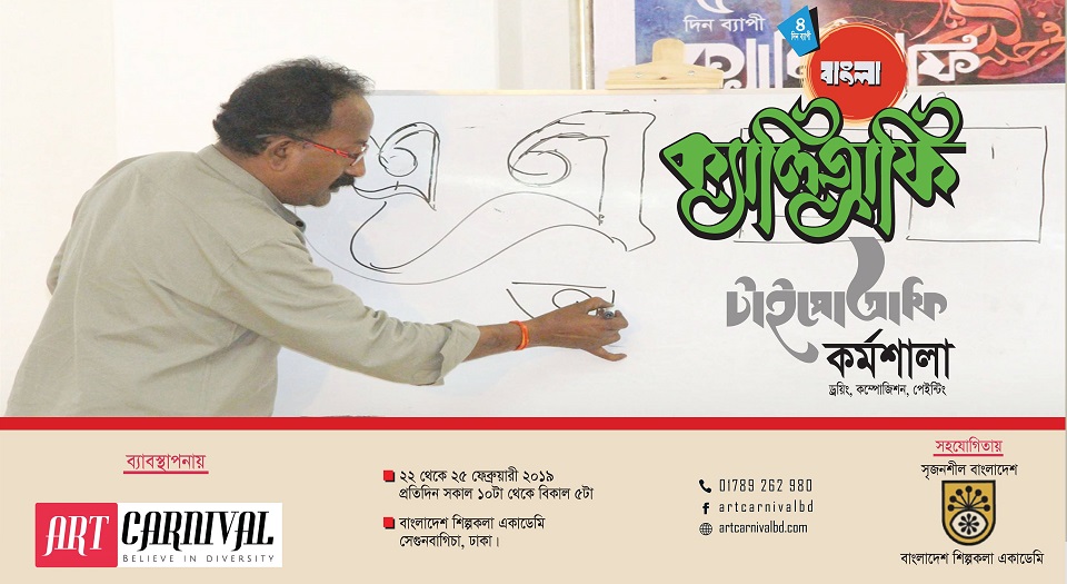 আন্তর্জাতিক মাতৃভাষা ও জাতীয় শহীদ দিবস উপলক্ষে প্রথমবারের মতো বাংলাদেশ শিল্পকলা একাডেমিতে অনুষ্ঠিত হতে যাচ্ছে চার দিনব্যাপী বাংলা ক্যালিগ্রাফি ও টাইপোগ্রাফি প্রশিক্ষণ কর্মশালা। আর্ট কার্নিভালের ব্যবস্থাপনা ও বাংলাদেশ শিল্পকলা একাডেমির সহযোগিতায় কর্মশালাটি ২২ ফেব্রুয়ারি শুরু হয়ে চলবে ২৫ ফেব্রুয়ারি পর্যন্ত।