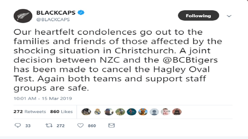 নিউজিল্যান্ডের ক্রাইশ্টচার্চে জুমার নামাজের সময় মসজিদে অজ্ঞাতনামা বন্দুকধারীর হামলার পর বাতিল করা হলো বাংলাদেশ দলের ৩য় টেস্ট।