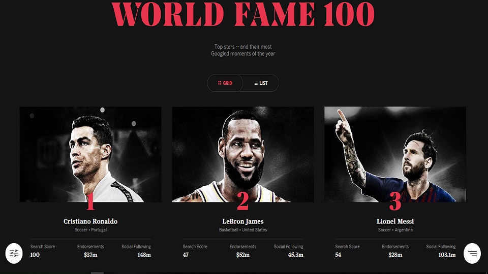 এ তালিকায় সবার আগে আছেন ফুটবল তারকা ক্রিশ্চিয়ানো রোনালদো। তালিকার তিন নম্বরে আছেন আর্জেন্টাইন ফুটবল তারকা লিওনেল মেসি। তালিকার ২য় স্থানে আছেন যুক্তরাষ্ট্রের বাস্কেটবল তারকা লেব্রন জেমস, চার নম্বরে আছেন ব্রাজিলীয় ফুটবল তারকা নেইমার জুনিয়র।