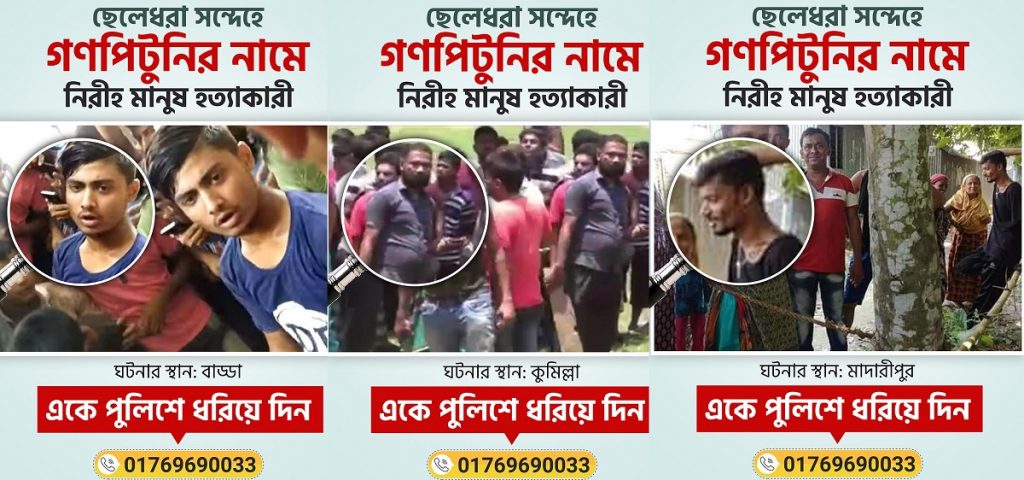 গণপিটুনির নামে নিরীহ মানুষদের এই হত্যাকারীদের ধরিয়ে দেয়ার জন্য একটি নম্বরও দেয়া হয়েছে। পুলিশ হেডকোয়াটার্সের ০১৭৬৯৬৯০০৩৩ নম্বরে তথ্য দিতে বলা হয়েছে।