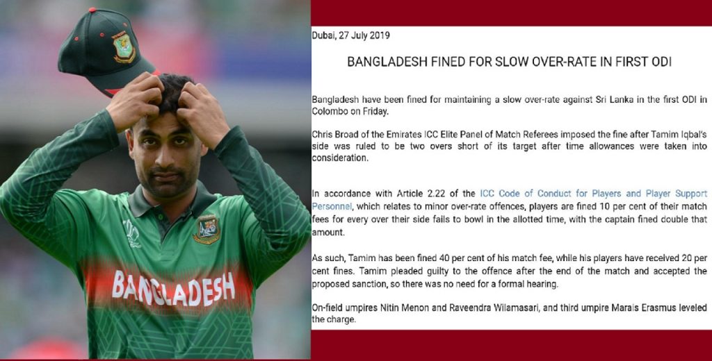 আইসিসির আচরণবিধির ২.২২ অনুচ্ছেদ অনুযায়ী স্লো রেটের জন্য ওভার প্রতি ম্যাচ ফির ১০ শতাংশ জরিমানা দিতে হবে। ফলে দুই ওভারের জন্য ম্যাচ ফির ২০ শতাংশ জরিমানা দিতে হবে বাংলাদেশের ক্রিকেটারদের। তবে, নিয়ম অনুযায়ী দলের অধিনায়ক তামিমকে জরিমানা দিতে হবে দ্বিগুণ অর্থাৎ ম্যাচ ফির ৪০ শতাংশ। বাংলাদেশের অধিনায়ক দোষ স্বীকার করায় আনুষ্ঠানিক কোনো শুনানির দরকার হচ্ছে না।