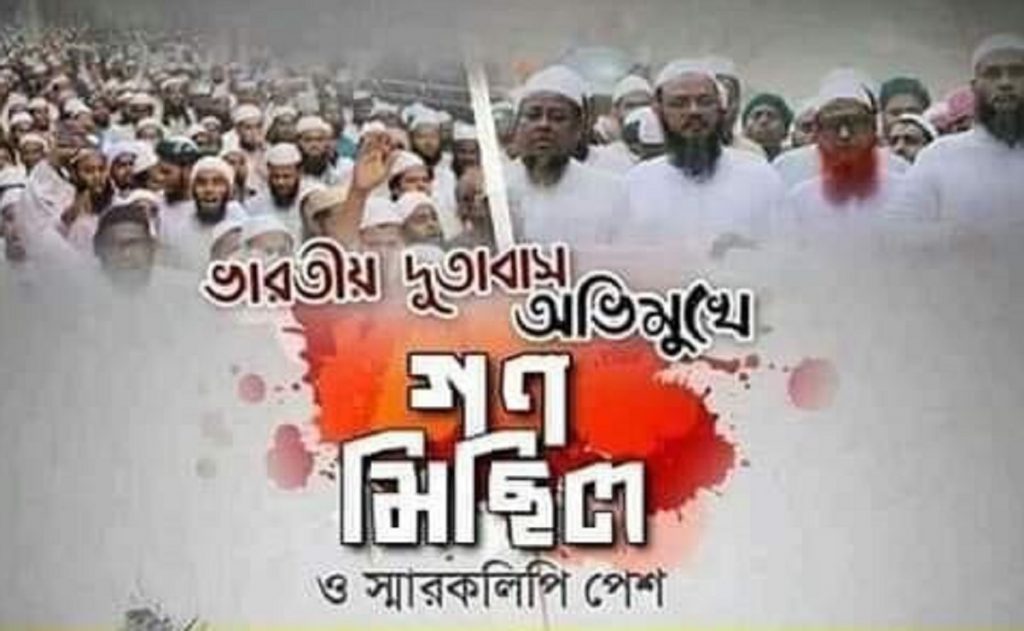 প্রসঙ্গত, ভারতে মুসলিম নিধন বন্ধের দাবিতে গত ৫ জুলাই বিক্ষোভ সমাবেশ ও মিছিল এবং ১১ জুলাই গোলটেবিল বৈঠক ও ১৩ জুলাই সারা দেশে বিক্ষোভ কর্মসূচি পালন শেষে দূতাবাস অভিমুখে গণমিছিল কর্মসূচি ঘোষণা করে চরমোনাই পীরের দল ইসলামী আন্দোলন বাংলাদেশ। ইতিমধ্যে গণমিছিলের সব প্রস্তুতি সম্পন্ন হয়েছে বলে দলটির পক্ষ থেকে জানানো হয়েছে।