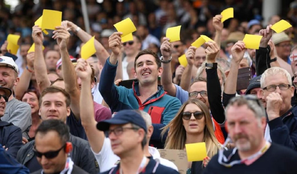 বিষয়টি এখানেই ক্ষ্যান্ত হননি। ডেভিড ওয়ার্নার আউট হলে তা অন্য মাত্রা পায়। স্টুয়ার্ট ব্রডের বলে এলবিডব্লিউ হয়ে সাজঘরে ফেরেন তিনি। পথিমধ্যে গ্যালারির একটা অংশের দর্শক দাঁড়িয়ে তাকে ‘হলুদ কার্ড’-দেখান। সেগুলো ছিল শিরিশ কাগজ।