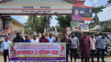 সাংবাদিককে হুমকির প্রতিবাদে বাউফলে মানববন্ধন