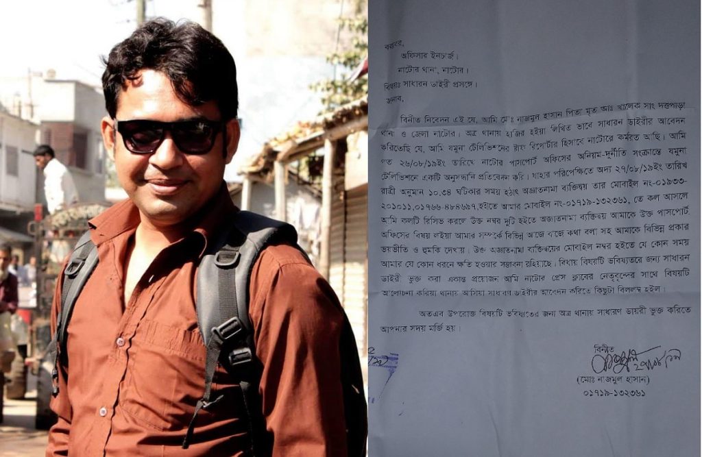 নাটোরের আঞ্চলিক পাসপোর্ট অফিসের দুর্নীতি নিয়ে সংবাদ প্রকাশ করায় যমুনা টিভির স্টাফ রিপোর্টার নাজমুল হাসানকে মোবাইল ফোনে হুমকি দিয়েছে দুর্বৃত্তরা। মঙ্গলবার (২৭ আগস্ট) রাত সাড়ে ১০টার দিকে পরপর দুটি নাম্বার থেকে ফোন করে হুমকি দেয়া হয়। এসময় অকথ্য ভাষায় গালাগালসহ আর কখনো পাসপোর্ট অফিস নিয়ে সংবাদ না করতে হুঁশিয়ারি দেয়া হয়। এরপরও সংবাদ করলে দেখে নেয়া হবে বলা হয়। এ ব্যাপারে নাজমুল হাসান নাটোর সদর থানায় একটি সাধারণ ডায়েরি করেছেন।