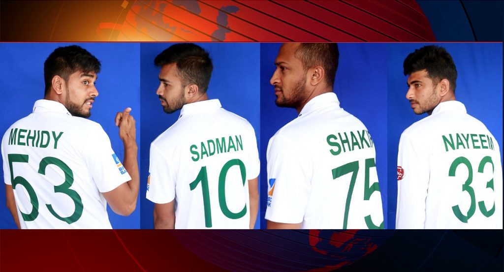 টেস্ট দলের জার্সি উন্মোচন করা হলো বাংলাদেশের। নাম ও নাম্বারসহ নতুন এই জার্সি পরে আজ ছবি তোলেন বাংলাদেশ দলের সাকিব-মিরাজ-সাদমানরা।