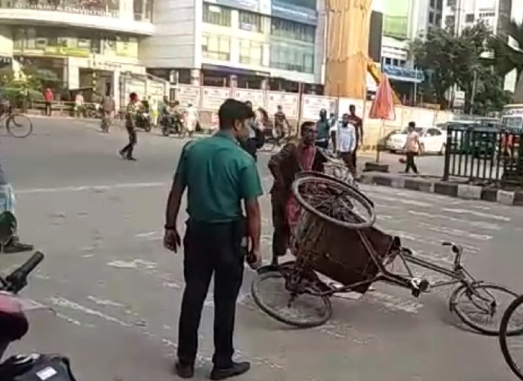 রিক্সাওয়ালার অভিমানে কী যায় আসে ট্রাফিক পুলিশের? বাংলামোটর মোড়ে সিগন্যাল পড়ায় একটু চাপিয়ে রিক্সা রেখেছিলো এক চালক। এতে সামনে এগুতে পারছিলো না একটি চকচকে প্রাইভেট কার। ঘটনা নজরে পড়ে ট্রাফিক পুলিশের। কোন কৈফিয়তের সুযোগ না দিয়ে ধাক্কা মেরে রাস্তায় ফেলে দেয় রিক্সা।