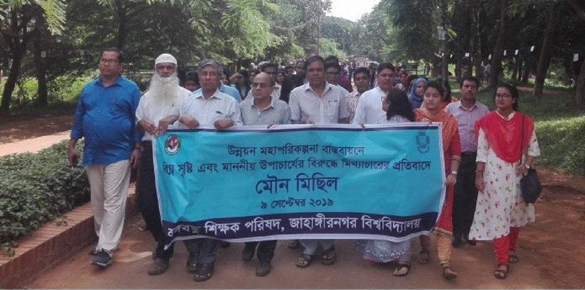 জাহাঙ্গীরনগর বিশ্ববিদ্যালয়ের অধিকতর উন্নয়ন প্রকল্প- এর কাজে বাঁধা সৃষ্টি এবং উপাচার্যের বিরুদ্ধে মিথ্যাচারের প্রতিবাদে মৌন মিছিল ও প্রতিবাদ সমাবেশ করেছে বিশ্ববিদ্যালয়ের উপাচার্যপন্থী শিক্ষকরা।