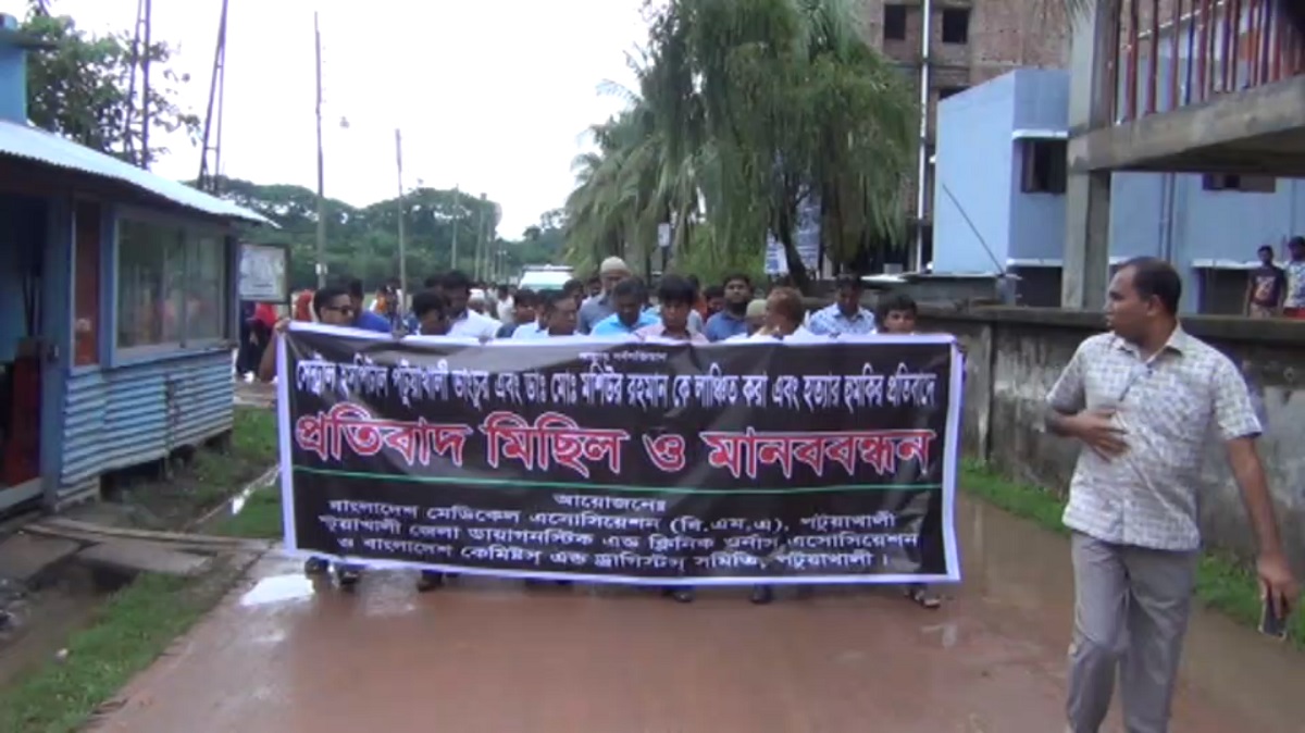 আজ দুপুর আড়াইটার দিকে পটুয়াখালী মেডিকেল কলেজ থেকে বিক্ষোভ মিছিলটি বের হয়ে বিভিন্ন সড়ক প্রদক্ষিণ শেষে পটুয়াখালী প্রেসক্লাবের সামনে গিয়ে শেষ হয়। পরে সেখানে ঘণ্টাব্যাপী মানববন্ধন কর্মসূচি পালন করেন। মানববন্ধনে অন্যান্যদের মধ্যে বক্তব্য রাখেন বিএমএ জেলা শাখার সভাপতি ডাঃ মিজানুর রহমান, ডায়াগনোস্টিক ও ক্লিনিক ওনার্স এ্যাসোসিয়েশনের সভাপতি ডাঃ জগন্নাথ পাল, বিএমএর সাধারণ সম্পাদক ডাঃ পরিমল চন্দ্র, ডায়াগনোস্টিক ও ক্লিনিক ওনার্স এ্যাসোসিয়েশনের সাধারণ সম্পাদক বশির আহমেদ মৃধা প্রমূখ।