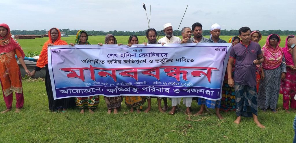 মানববন্ধনে অংশ নেয়া ক্ষতিগ্রস্ত পরিবারের সদস্যরা জানান, পটুয়াখালীর লেবুখালীতে নির্মাণাধীন শেখ হাসিনা সেনা নিবাসের জন্য যে জমি অধিগ্রহণ করা হয়েছে তাতে বরিশাল জেলার জমির মালিকদের ক্ষতিপূরন দেয়া হলেও পটুয়াখালী জেলার দুমকি উপজেলার আলগী মৌজার ক্ষতিগ্রস্ত জমির মালিকদের কোনও ক্ষতিপূরণ কিংবা ভর্তুকি প্রদান করা হয়নি। ক্ষতিপূরণ প্রাপ্তিতে তারা প্রধানমন্ত্রীর হস্তক্ষেপ কামনা করেন।