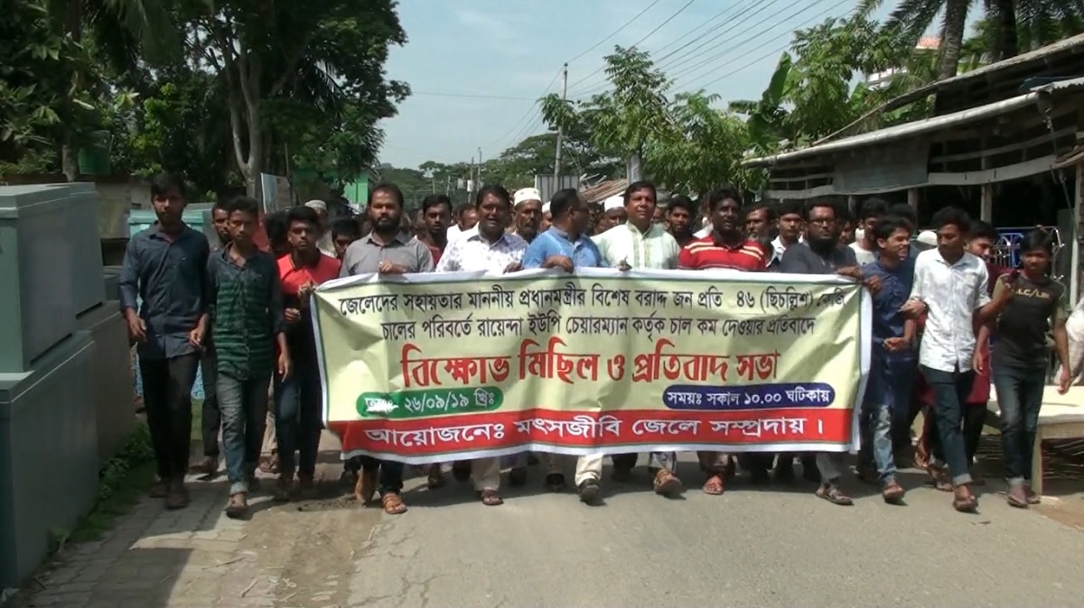 বাগেরহাটের শরণখোলায় রায়েন্দা ইউপি চেয়ারম্যান কর্তৃক জেলেদের জন্য প্রধানমন্ত্রীর দেয়া সহায়তার চাল কম দেয়ায় বিক্ষোভ মিছিল ও মানববন্ধন কর্মসূচি পালিত হয়েছে। বৃহস্পতিবার সকালে শরণখোলার পাঁচরাস্তা মোড়ে মৎস্যজীবী সমিতির ব্যানারে ঘণ্টাব্যাপী এই মানববন্ধন কর্মসুচি পালন করা হয়। মানববন্ধন শেষে বিক্ষোভ মিছিল বিভিন্ন সড়ক প্রদক্ষিণ শেষে প্রেসক্লাবের সামনে পথসভা করে চাল বঞ্চিতরা।