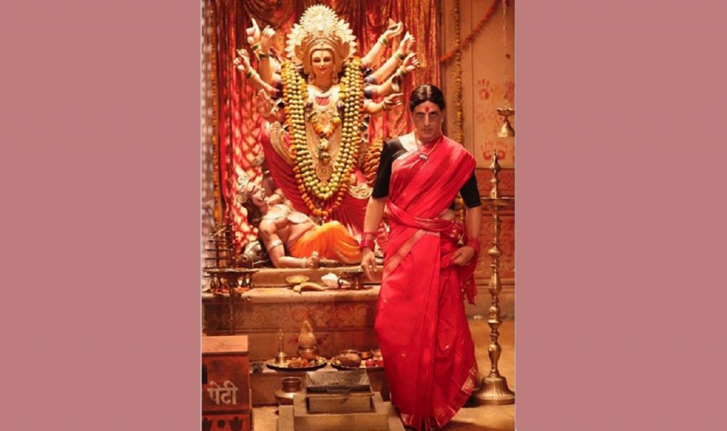 পিছনে দেবি দুর্গার মূর্তি। সামনে দাঁড়িয়ে বলিউড স্টার অক্ষয় কুমার। তবে জিন্স-টিশার্টের বদলে তিনি পরে রয়েছেন লাল রঙের শাড়ি ও কালো রঙের ব্লাউজ। কপালে রয়েছে লাল রঙের বড় টিপ ও দু’হাতে লাল রঙের চুড়ি।