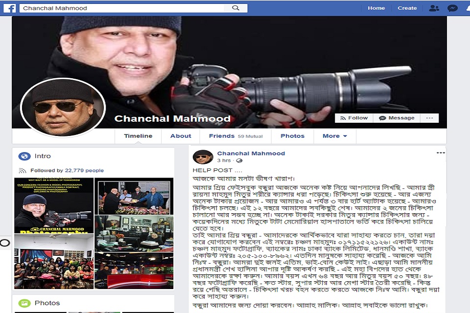 তাই আমার প্রিয় বন্ধুরা – আমাদেরকে আর্থিকভাবে যারা সাহায্য করতে চান, তারা দয়া করে যোগাযোগ করবেন এই নম্বরেঃ চঞ্চল মাহমুদঃ ০১৭১১৫২২১২৬। একাউন্ট নামঃ চঞ্চল মাহমুদ ফটোগ্রাফি, ব্যাংকের নামঃ ঢাকা ব্যাংক লিমিটেড, ধানমণ্ডি শাখা, ব্যাংক একাউন্ট নম্বরঃ ২০৫-১০০-৮৯৬২। এতদিন মানুষকে সাহায্য করেছি – আজকে আমি নিঃস্ব – বন্ধুরা। আমরা দুই জনই এতিম, ভাই-বোন কেউই নাই। এছাড়া আমি মাননীয় প্রধানমন্ত্রী শেখ হাসিনা আপার দৃষ্টি আকর্ষণ করছি – এই মহা বিপদের হাত থেকে আমাদেরকে রক্ষা করুন। আমার বয়স এখন ৬৪ বছর আর মিতুর বয়স ৫০ বছর। ৪৮ বছর ফটোগ্রাফি করেছি – কত স্টার, সুপার স্টার আর মেগা স্টার তৈরী করেছি – কিন্তু রয়ে গেছি অন্তরালে – চিকিৎসা খরচ বহন করতে করতে আজকে নিঃস্ব আমি। বন্ধুরা দয়া করে সাহায্য করুন।
