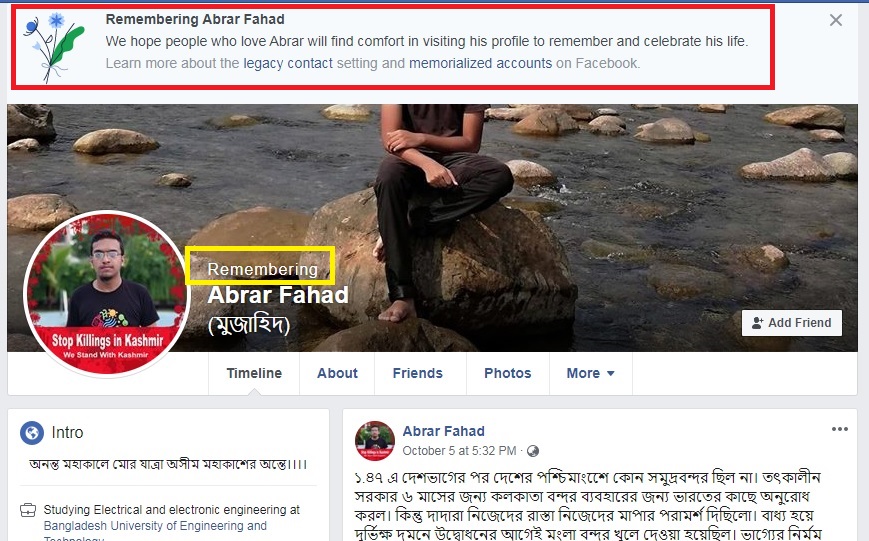 ফেসবুক তার প্রফোইল ছবির ওপরে লিখেছে, “We hope people who love Abrar will find comfort in visiting his profile to remember and celebrate his life.”
