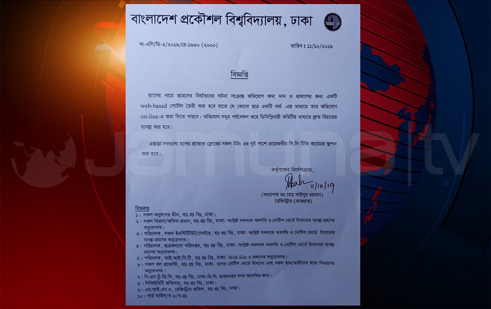 বিজ্ঞপ্তিতে বলা হয়, র্যাগের নামে ছাত্রদের নির্যাতনের ঘটনা সংক্রান্ত অভিযোগ জমা দান ও প্রকাশের জন্য একটি ওয়েব-বেজড পোর্টাল তৈরী করা হবে যাতে যে কোনো ছাত্র একটি ফর্ম -এর মাধ্যমে তার অভিযোগ অনলাইন-এ জমা দিতে পারবে। অভিযোগ সমূহ পর্যবেক্ষণ করে ডিসিপ্লিনারী কমিটির মাধ্যমে দ্রুত বিচারের ব্যবস্থা করা হবে।