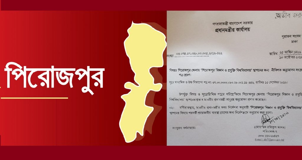 পিরোজপুরে বিজ্ঞান ও প্রযুক্তি বিশ্ববিদ্যালয় স্থাপনের চূড়ান্ত অনুমোদন প্রদান করেছেন প্রধানমন্ত্রী শেখ হাসিনা। গত ১০ অক্টোবর নীতিগত অনুমোদন সংক্রান্ত প্রধানমন্ত্রীর কার্যালয় থেকে শিক্ষা মন্ত্রণালয়ে পাঠানো হয়েছে। প্রধানমন্ত্রী কার্যালয়ের পরিচালক মো. রফিকুল ইসলাম স্বাক্ষরিত এই চিঠিতে শিক্ষা মন্ত্রণালয়কে প্রয়োজনীয় ব্যবস্থা নিতে বলা হয়েছে। এর আগে, গত ২ জুলাই পিরোজপুর-১ আসনের এমপি গৃহায়ণ ও গণপূর্ত মন্ত্রী শ ম রেজাউল করিম পিরোজপুরে একটি বিজ্ঞান ও প্রযুক্তি বিশ্ববিদ্যালয় স্থাপনের জন্য প্রধানমন্ত্রীর কাছে আবেদন করেন।