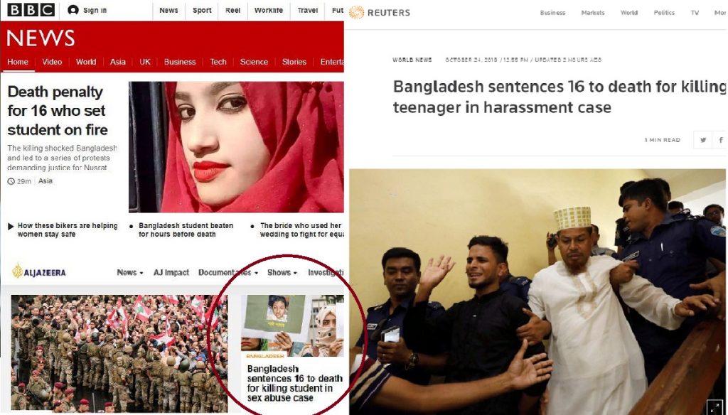 নুসরাত হত্যায় ১৬ জনের মৃত্যুদণ্ডের খবর প্রকাশ করেছে রয়টার্সও। আর বাংলাদেশের কিশোরীকে আগুন দিয়ে পোড়ানোর ঘটনায় ১৬ জনের মৃত্যুদণ্ডের খবর প্রকাশ করে এটি ‘বর্বর’ বলে উল্লেখ করেছে এএফপি।