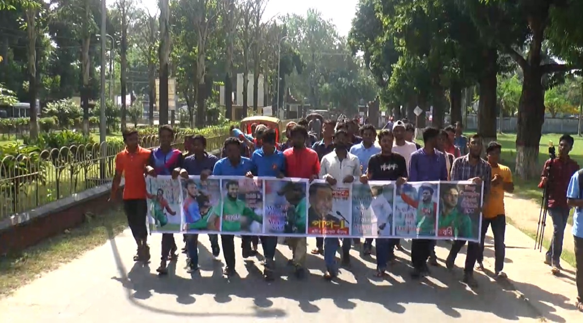 ক্রিকেটার সাকিব আল হাসানকে নিষিদ্ধ করার প্রতিবাদে বিক্ষোভ মিছিল, সড়ক অবরোধ ও মানববন্ধন করেছে রাজশাহী বিশ্ববিদ্যালয়ের শিক্ষক-শিক্ষার্থীরা।