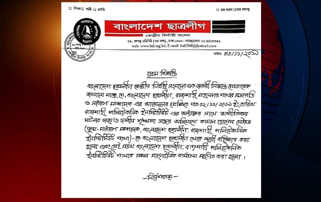 রাজশাহী পলিটেকনিক ইনস্টিটিউটের ছাত্রলীগের সব ধরনের সাংগাঠনিক কার্যক্রম স্থগিত করেছে কেন্দ্রীয় ছাত্রলীগ। সেই সাথে ইনস্টিটিউট শাখার যুগ্ম সাধারণ সম্পাদক কামাল হোসেন সৌরভকে অধ্যক্ষের সাথে অপ্রীতিকর ঘটনা ও দলীয় শৃঙ্খলা ভঙ্গের অভিযোগে স্থায়ীভাবে দলথেকে বহিষ্কার করা হয়েছে।