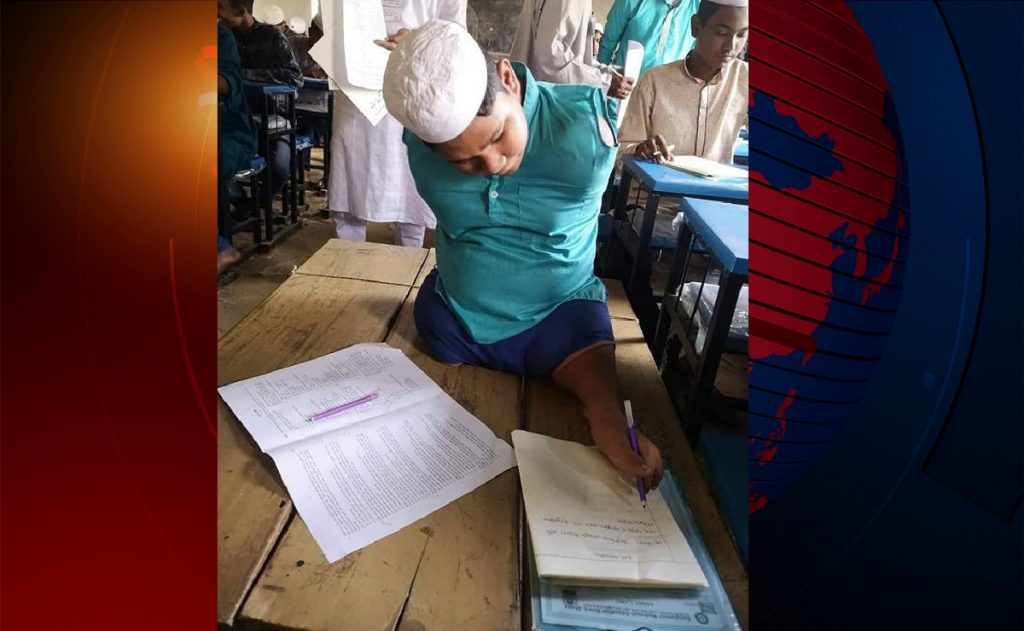 জন্ম থেকেই দুই হাত নেই। নেই ডান পা। বাম পা রয়েছে, তা-ও আবার স্বাভাবিকের চেয়ে অনেকটা ছোট। পায়ের আঙুলের ফাঁকে কলম রেখে নিয়মিত জেডিসি পরীক্ষা দিচ্ছে নাটোরের সিংড়া উপজেলার শোলাকুড়া মহল্লার কিশোর রাসেল।