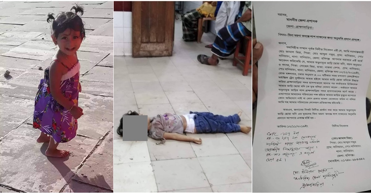 তাতে লিখেছেন, “আপনার বরাবরে এই মর্মে আবেদন করিতেছি যে, আমার অধুনামৃত ভাগ্নি ছোঁয়া মনি, বয়স অনুমান ৩ বৎসর, পিতা: সোহেল মিয়া, মাতা: নাজমা বেগম, গ্রাম: বানিয়াচং, পোস্ট বানিয়াচং, থানা বাহিনয়াচং, জেলা: হবিগঞ্জ অদ্য ১২ নভেম্বর মঙ্গলবার ভোর অনুমান ৪ ঘটিকার সময় মন্দবাগ রেলস্টেশনে মর্মান্তিক ট্রেন দুর্ঘটনায় আহত হইলে আমার ভাগ্নি ছোঁয়া মনিকে উদ্ধার করিয়া ব্রাহ্মণবাড়িয়া সদর হাসপাতালে আনার পর কর্তব্যরত চিকিৎসক আমার ভাগ্নি ছোঁয়া মনিকে মৃত বলিয়া ঘোষণা করেন। বর্তমান আমার অধুনামৃত ভাগ্নির লাশ ব্রাহ্মণবাড়িয়া সদর হাসপাতালের মর্গে আছে। এ ব্যাপারে আমাদের পরিবারের পক্ষ হইতে আমার ভাগ্নির মৃত্যুর ব্যাপারে কোন অভিযোগ নাই বা কোনো প্রকার মামলা মোকদ্দমা করিব না বলিয়া আমিসহ আমার পরিবারের লোকজন প্রতিজ্ঞাবদ্ধ হইতেছি।”