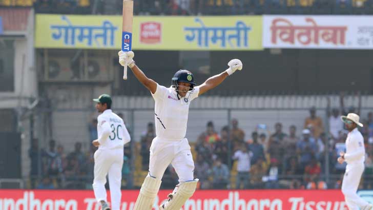 ইনিংসের শুরু থেকে দুর্দান্ত ব্যাটিং করে যাওয়া মায়াঙ্ক আগরওয়াল অফ স্পিনার মেহেদী হাসান মিরাজকে বাউন্ডারি হাঁকিয়ে ৩০৩ বলে ডাবল সেঞ্চুরি করেন। ডাবল সেঞ্চুরি পূর্ণ করার পর একের পর এক বাউন্ডারি হাঁকিয়ে যাওয়া এই ওপেনারকে রাহীর ক্যাচে পরিনত করেন মিরাজ। বাউন্ডারি হাঁকাতে গিয়ে ক্যাচ তুলে দেন মায়াঙ্ক। তার আগে ৩৩০ বলে ২৮টি চার ও ৮টি ছক্কায় ২৪৩ রান করে ফেরেন মায়াঙ্ক।