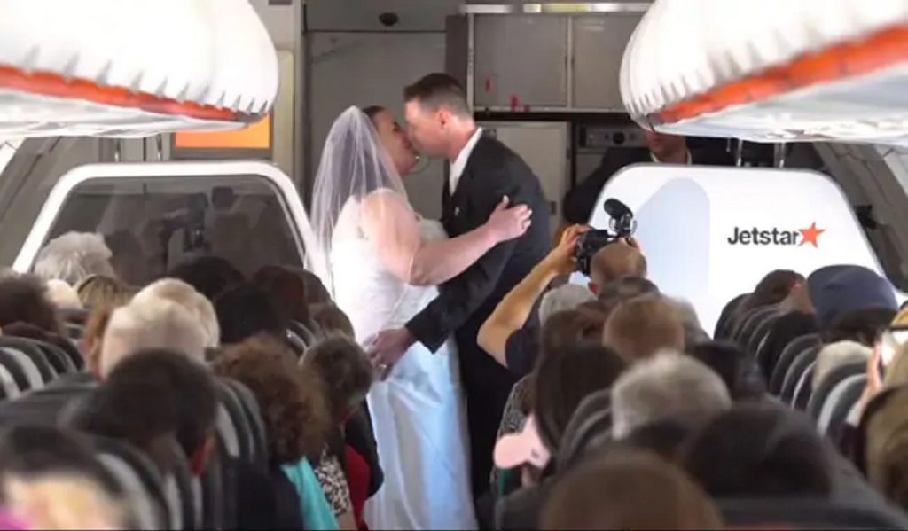 এয়ারপোর্ট- আসা যাওয়ার মাঝে এক টানাপোড়েনের নাম। আর সেখানেই কিনা দেখা হয়ে প্রেম হয়ে গেলো এক যুগলের। অতঃপর বিয়েটা সেরে নিলেন বিমানে। এ যেন সিনেমাকেও হার মানানো এক গল্প।