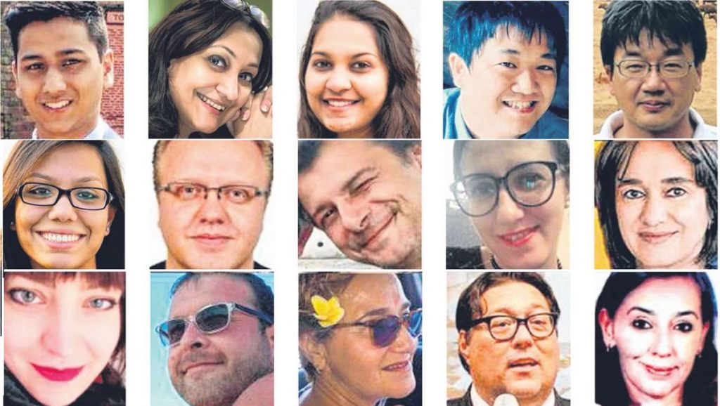 এদের মধ্যে নয়জন ইতালির নাগরিক, সাতজন জাপানের নাগরিক, একজন ভারতীয় নাগরিক, একজন বাংলাদেশ-আমেরিকার দ্বৈত নাগরিক, দু’জন বাংলাদেশি নাগরিক ও দু’জন পুলিশ কর্মকর্তা রয়েছেন।