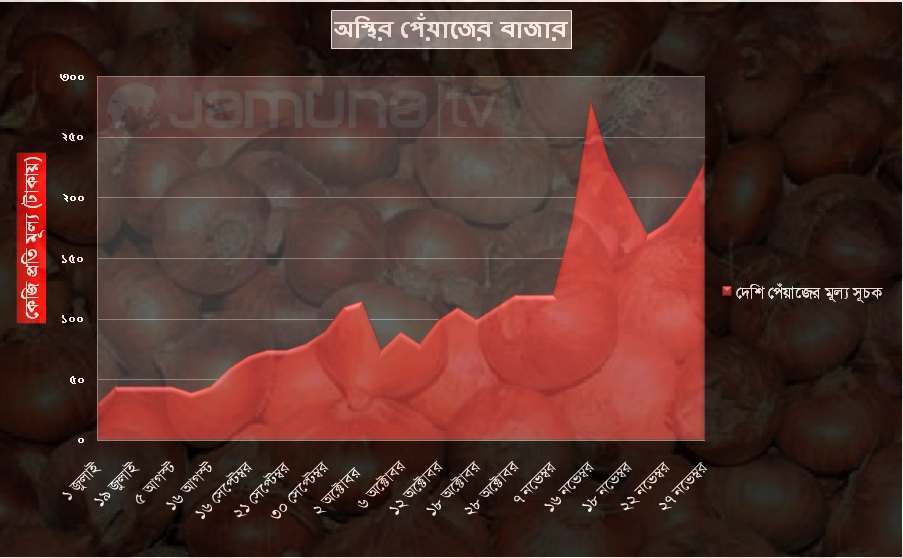 পেঁয়াজ বাজারে লাগাম টানা যাচ্ছে না। গেলো সেপ্টেম্বর থেকে সেটি পুরোপুরিই নিয়ন্ত্রণহীন হয়ে পড়ে। তবে , আগে থেকেই ধাপে ধাপে দর বাড়ছিলো পেঁয়াজের। রাজধানীর বাজারদর বিশ্লেষণ করে দেখা গেছে, গত পহেলা জুলাইয়েও দেশি পেঁয়াজের মূল্য ছিল কেজি প্রতি ৩০ টাকা যেটি ২৭ নভেম্বর পর্যন্ত বেড়ে দাঁড়িয়েছে কেজি প্রতি ২৩০ টাকায়!