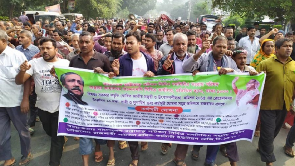 মজুরি কমিশন বাস্তবায়ন এবং বকেয়া বেতন-ভাতাসহ ১১ দফা দাবিতে বিক্ষোভ সমাবেশ করেছে পাটকল শ্রমিকরা।