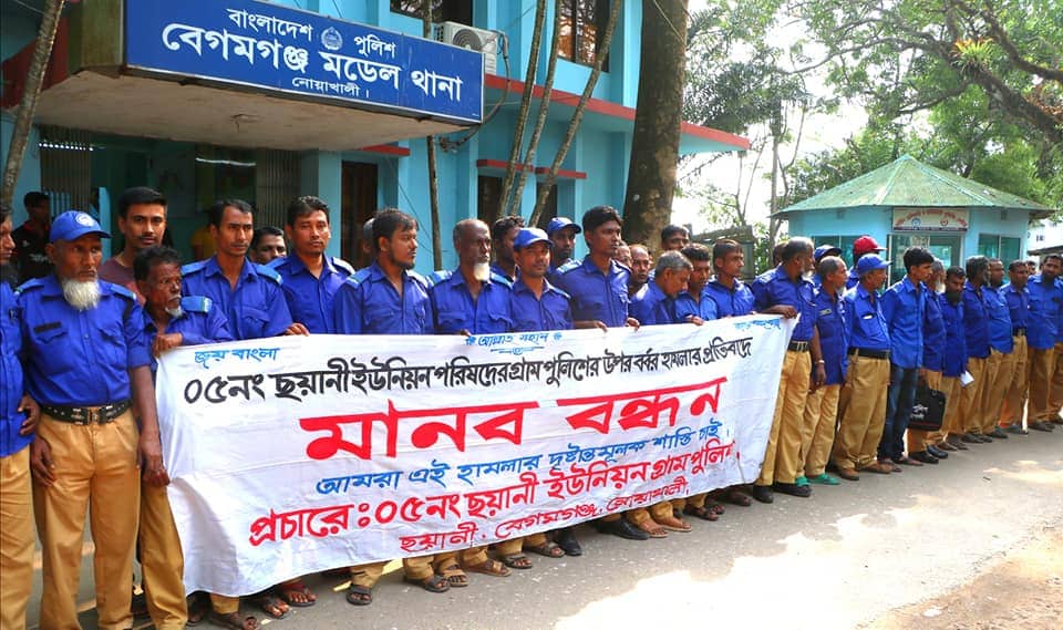 নোয়াখালীর বেগমগঞ্জ উপজেলার ছয়ানী ইউনিয়নের ২ নং ওয়ার্ড এর গ্রাম পুলিশ সদস্য বেল্লাল হোসেন এর উপর হামলা ঘটনায় আসামীদের গ্রেফতারের দাবিতে মানববন্ধন ও বিক্ষোভ মিছিল করেছে বিভিন্ন ইউনিয়নের গ্রাম পুলিশ সদস্যরা।